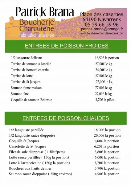 Comme chaque année, votre boucherie charcuterie Patrick Brana à Navarrenx vous propose sa carte des fêtes de fin d’année. Découvrez nos entrées froides, chaudes, viandes festives et poissons et faites votre choix pour vos repas de fin d’années :
