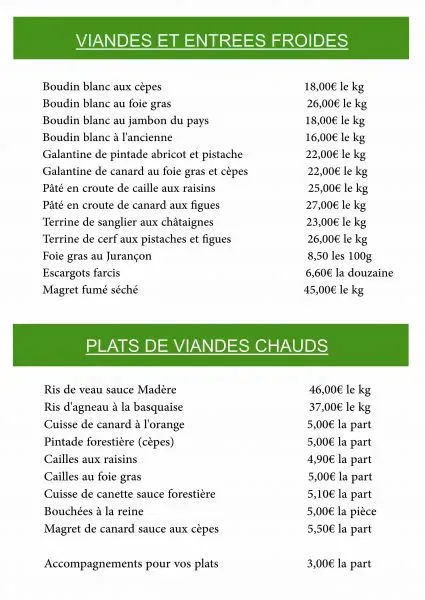 - Plats cuisinés traditionnels (terrine de sanglier, boudin blanc, galantine de pintade ou canard, terrine de cerf, magret fumé etc…)