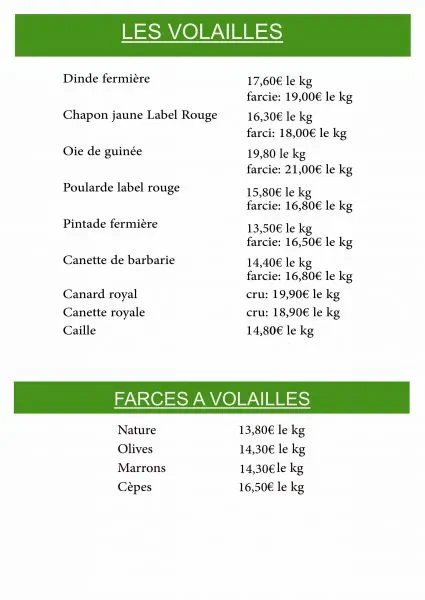 - Volailles festives (poularde label rouge, pintade fermière, chapon label rouge, dinde fermière, canard royal etc…)